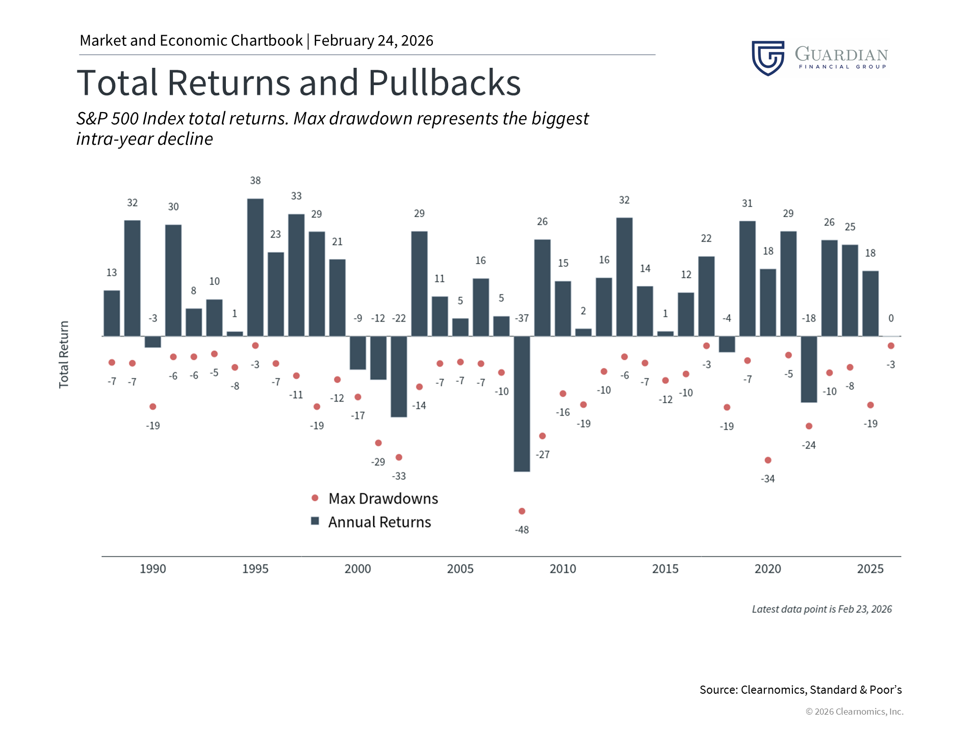 The most evident lesson from the past year of tariff volatility is one that applies to virtually every period of market and policy uncertainty: by far the best course of action for investors was to remain invested. Attempting to predict the precise effect of tariffs on the economy and markets is not only difficult but counterproductive. As the accompanying chart illustrates, years that have featured significant intra-year pullbacks have very often still concluded with positive returns.